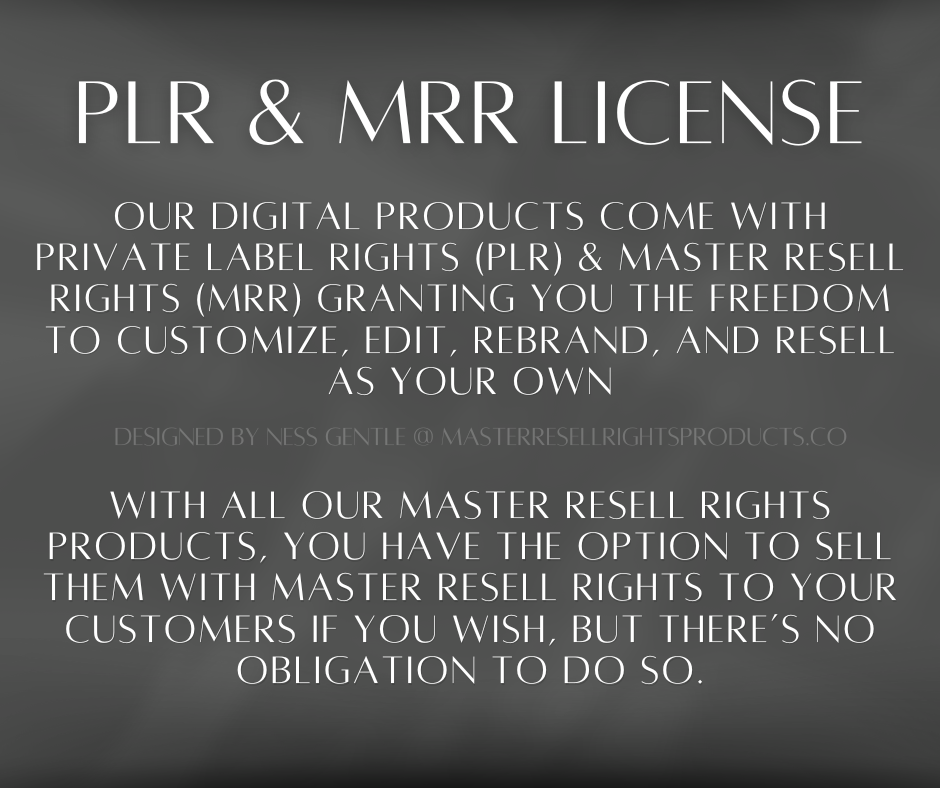 Our digital products come with Private Label Rights (PLR) & Master Resell Rights (MRR) granting you the freedom to customize, edit, rebrand, and resell as your own.