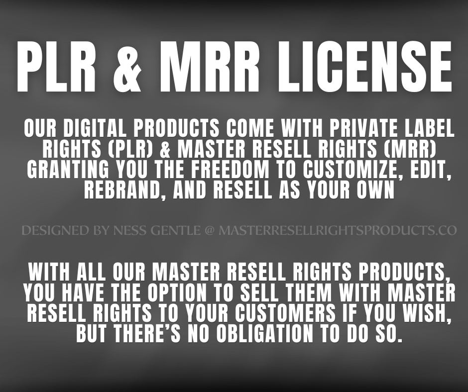 Our digital products come with Private Label Rights (PLR) & Master Resell Rights (MRR) granting you the freedom to customize, edit, rebrand, and resell as your own.