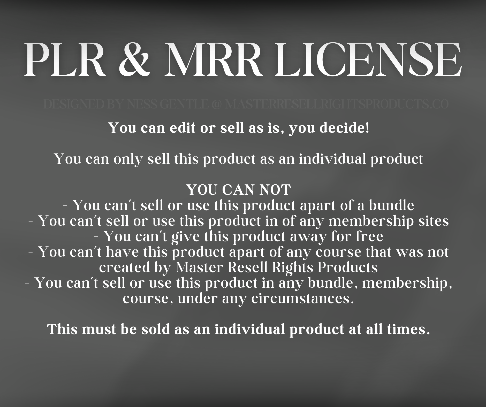- You can’t use this product in any course that was not created by Master Resell Rights Products